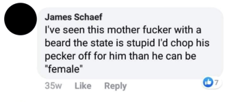“I’ve seen this mother fucker with a beard,” correctional officer James Schaefer, who appears on Facebook under the name James Schaef, wrote in one group, after a post was shared last December about the transfer of a then-incarcerated transgender woman, Strawberry Hampton, to a women’s facility. “The state is stupid I’d chop his pecker off for him than he can be ‘female.’”
